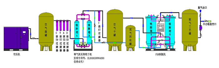 環(huán)境空氣經(jīng)壓縮凈化,除去油、水、塵后,進(jìn)入由兩個(gè)裝填有碳分子篩的吸附塔組成的變壓吸附裝置。壓縮空氣由下至上流經(jīng)吸附 塔,其間氧分子在碳分子篩表面吸附,氮?dú)庥晌剿隙肆鞒?,進(jìn)入粗氮緩沖罐,經(jīng)過一段時(shí)間后,吸附塔中碳分子篩被吸附的氧飽和,需進(jìn)行再生。再生是通過停止吸附步驟,降低吸附塔壓力來(lái)實(shí)現(xiàn)的。兩個(gè)吸附塔交替進(jìn)行吸附和再生,從而確保氮?dú)獾倪B續(xù)輸出。
