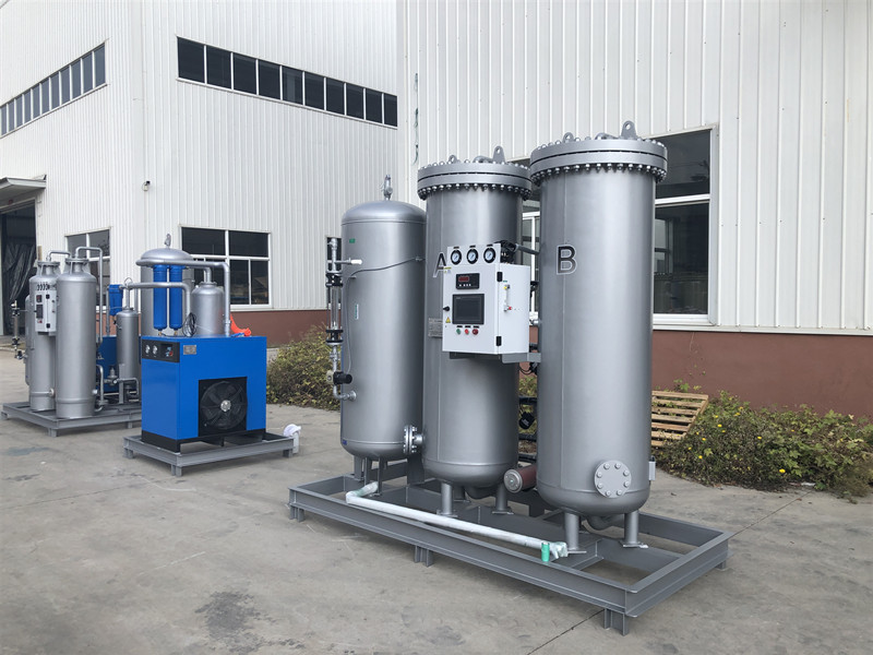 變壓吸附制氧裝置以潔凈的壓縮空氣為原料,采用高品質(zhì)的沸石分子篩作為吸附劑,在一定的壓力下,從空氣中制取氧氣。經(jīng)過純化干燥的壓縮空氣,在吸附器中進行加壓吸附、減壓脫附。由于空氣動力學效應(yīng),氮在沸石分子篩微孔中擴散速率遠大于氧,氮被沸石分子篩優(yōu)先吸附,氧在氣相中被富集起來,形成成品氧氣。然后經(jīng)減壓至常壓,吸附劑脫附所吸附的氮氣等雜質(zhì),實現(xiàn)再生。一般在系統(tǒng)中設(shè)置兩個吸附塔,一塔吸附產(chǎn)氧,另一塔脫附再生,通過PLC程序控制器控制氣動閥的啟閉,使兩塔交替循環(huán),從而取得純度較高的氧氣(93%±3%)。