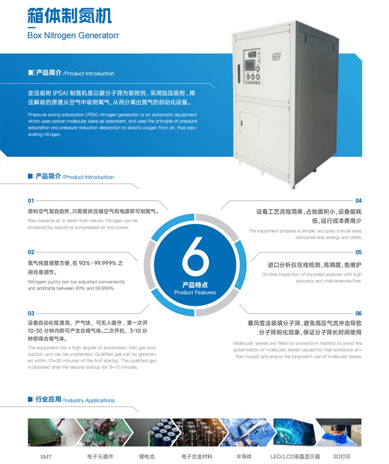 環(huán)境空氣經(jīng)壓縮凈化,除去油、水、塵后,進入由兩個裝填有碳分子篩的吸附塔組成的變壓吸附裝置。壓縮空氣由下至上流經(jīng)吸附 塔,其間氧分子在碳分子篩表面吸附,氮氣由吸附塔上端流出,進入粗氮緩沖罐,經(jīng)過一段時間后,吸附塔中碳分子篩被吸附的氧飽和,需進行再生。再生是通過停止吸附步驟,降低吸附塔壓力來實現(xiàn)的。兩個吸附塔交替進行吸附和再生,從而確保氮氣的連續(xù)輸出。